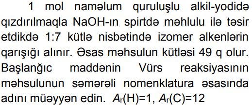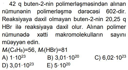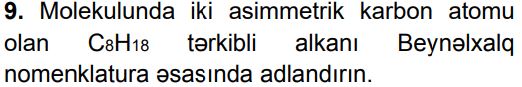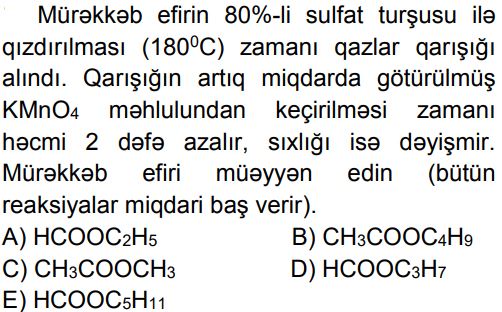 Kimya – Olipiada sualları (11 sinif) Zəhmət olmasa, gözləyin... 1. A..B..C..D..E.. 2. A..B..C..D..E.. 3. A. 1B. 9C. 18D. 24E. 36 4. A..B..C..D..E.. 5. A..B..C..D..E.. 6. A. 13B. 17C. 21D. 25E. 19 7. A. 8B. 10C. 12 D. 14E. 18 8. A.7,1B.14,2C.11,3D.18,1E.11,0 9. A.2,4-dimetilheksanB.2,3-dimetilheksanC.2,5-dimetilheksanD.3,3-dimetilheksan E.3,4-dimetilheksan 10. A.20% HCOOH, 40% CH3COOH, 40% HCHO B.25% HCOOH, 50% CH3COOH, 25% HCHOC.10% HCOOH, 50% CH3COOH, 40% HCHOD.20% HCOOH, 30% CH3COOH, 50% HCHOE.30% HCOOH, 20% CH3COOH, 50% HCHO 11. A. I, II B. II, IIIC. I, III D. I, IV E. II, IV 12. A.1, 2B. yalnız 2C.2, 4D.3, 4E. yalnız 4 13. A..B..C..D..E.. 14. A.21B.42C.84D.75E.63 15. A. 1, 3B. 1, 4C. yalnız 2 D. 2, 3E. 3, 4 16. A.322B.142C.161D.71E.284 17. A.metiletilikili-butilmetanB.trimetilüçlü-butilmetanC.izopropilizobutilmetanD.metilpropilizopropilmetanE.metildietilmetan 18. A.2,24B.44,8C.22,4D.11,2E.4,48 19. Stirol molekulunda rabitələrin əmələ gəlməsində iştirak edən qeyri-hibrid orbitalların ümumi sayını müəyyən edin. A.12B.14C.16D.18E.24 20. A..B..C..D..E.. 21. A.2b – aB.b – a C.2a – b D.2b + a E.2a + b 22. A.1, 3, 5 B.yalnız 2, 4, 6 C.1, 2, 3, 4 D.2, 3, 5 E.1, 2, 4, 6 23. A..B..C..D..E.. 24. A..B..C..D..E.. 25. A.8,4B.8,5C.8,6D.8,8E.8,9 Loading...