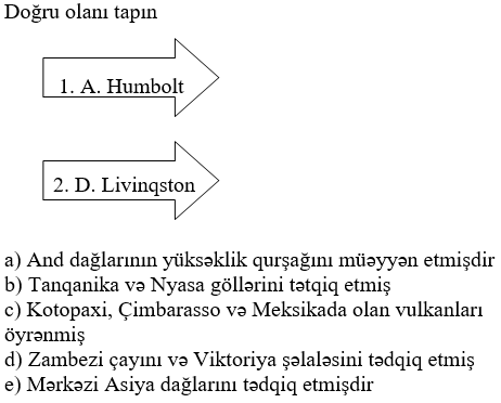 Coğrafiya bölmələr Coğrafiyanın inkişaf mərhələləri tehsilim.info 960 Views Zəhmət olmasa, gözləyin... 1. Yüksək coğrafi enliklərin (qütb ətrafı ərazilər) öyrənilməsində xidməti böyük olmuşdur:A.R. Piri, R. Amundsen, R. SkottB.R. Amundsen, A. Düma, X. KolumbC.F. Magellan, V. Qama, C. KukD.F. Bellinshauzen, A. Vespuççi, V. YansonE.H. Z. Şirvani, R. Piri, A. Tasman 2. A.A. Humbolt B.H.M. StenliC.V. Yanson D.H.Z.ŞirvaniE.D. Livinqston 3. A.1 – b, c, d; 2 – a, eB.1 – a, c, e; 2 – b, dC.1 – b, d; 2 – a, c, e D.1 – b, e; 2 – a, c, d E.1 – a, d; 2 – b, c, e 4. Uyğunluğu tapın. 1. Azərbaycanın relyefi 2. Azərbaycanın iqlimi 3. Azərbaycanın daxili suları a) Ə. Şıxlınski b) B. Budaqov c) S. Rüstəmov d) M. Müseyibov e) Ə. MədətzadəA.1 – b, d; 2 – a; 3 – c, eB.1 – b, d; 2 – a, e; 3 – c C.1 – a; 2 – d, e; 3 – b, cD.1 – e; 2 – c, d; 3 – b, eE.1 – b, c; 2 – a, d; 3 – e 5. ...... Atlantik və Hind okeanları arasında əlaqə olduğunu sübut etmiş, Hindistana dəniz (su) yolunu tədqiq etmişdir. Nöqtələrin yerinə uyğun olan səyyahı tapın tapın:A.F. Magellan B.C. Kuk C.V. Qama D.X. Kolumb E.A. Vespuççi 6. F. Magellanın ekspedesiya üzvləri İspaniyaya qayıtdıqda gəmi jurnalında 1 təqvim gününün çatmadığını aşkar etdilər. Bunun səbəbi:A.yerin öz oxu ətrafında əksinə səyahət etmişdilər B.günəş şüalarının düşmə bucağının müxtəlif olmasıC.ekspedesiya üzvləri təqvim jurnalını itirmişdirlərD.yaz gecə - gündüz bərabərlyi günündə bu günün qeyd olunması düzgün deyildiE.o dövrdə Yerin kürə formasında olması haqqında fərziyyələr yox idi 7. İlkin coğrafi fikirlərin yarandığı ölkələr1. Misir 2. Avstraliya 3. Yunanıstan 4. YaponiyaA.2,3B.1,4C.1,3D.1,2E.3,4 8. A.2,3B.1,3C.2,5D.1,4E.1,5 9. Avstraliya meterikinin tədqiqində xidmətləri böyük olmuş səyyahlar1. V. Yanson 2. A. Humbolt 3. C. Kuk 4. M. Maxlay 5. A.P.Fedçenko 6. A. TasmanA.2, 3, 4, 5 B.1, 2, 5, 6 C.1, 2, 3, 5D.3. 4, 5, 6 E.1, 3, 4, 6 10. Böyük coğrafi kəşflər dövrünün ən mühüm hadisələri1. Antarktida materikinin kəşf edildi 2. dünya okeanının vahid olması aşkar olundu 3. yerin coğrafi və maqnit qütbləri kəşf olundu 4. Amerika qitəsi (Yeni dünya) kəşf olundu 5. ilk dünya səyahəti olduA.1,2,5B.3,4,5C.2,3,4D.2,4,5E.1,2,3 11. Eratosfen və Ptolomeyin xəritələrində göstərilən ərazilərdən deyil:1. Şimali Avropa 2. Cənub – Qərbi Asiya 3. Cənubi Avropa 4. Avstraliya 5. Şimali Afrika 6. Latın AmerikasıA.2,3,5B.1,3,6C.1,4,6D.1,4,5E.2,5,6 12. A.1, 2, 3, 6 B.1, 3, 4, 5 C.3, 4, 5, 6D.1, 2, 4, 5 E.2, 3, 5, 6 13. Doğru olanı tapın:1. Ptolomeyin xəritəsində meridian və paralellər (dərəcə toru) təsvir edilmiş, yerin əyriliyi nəzərə alınmışdır 2. F.Magellanın ekspedesiyasının üzvləri İspaniyaya qayıtdıqda gəmi jurnalında bir təqvim gününün çatmadığını aşkar etmişlər. Buna səbəb Yerin öz oxu ətrafında hərəkətinin əksinə səyahət etmələridir 3. Marko Polo, Afanasi Nikitin Böyük Coğrafi Kəşflər dövrünün səyyahlarıdır 4. R. Piri, R. Amundsenin qütb ətrafı ərazilərin öyrənilməsində xidmətləri böyük olmuşdur 5. X. Kolumun səyahəti zamanı yerin kürə formasında olması və Sakit okeanın mövcudluğu sübut olunduA.2,3,5B.1,3,6C.1,4,6D.1,2,4E.2,5,6 14. Uyğunluğu tapın:1. N. Tusi 2 N. Kopernik 3 M. Polo 4. A. Nikitin 5. K. Ptolomey a) Rusiya– Hindistan üzrə səyahət etmiş, “ Üç dəniz arxasına səyahət” əsərini yazmışdır b) ulduzlu səma qlobusunu tərtib etmişdir c) Avropa və Asiyanı birləşdirən “İpək Yolu” haqqında çoxlu məlumat vermişdir d) Yerin və digər planetlərin Günəş ətrafında fırlanmasını əsaslanaraq heliosentrik sistem nəzəriyyəsini irəli sürmüşdür e) Günəş və digər planetlərin Yer ətrafında fırlanmasını əsaslanaraq geosentrik sistem nəzəriyyəsini irəli sürmüşdürA.1 – a; 2 – d; 3 – b; 4 – a; 5 – e B.1 – b; 2 – d; 3 – a; 4 – c; 5 – e C.1 – a; 2 – d; 3 – c; 4 – a; 5 – b D.1 – b; 2 – d; 3 – c; 4 – a; 5 – e E.1 – d; 2 – c; 3 – b; 4 – e; 5 – a 15. Uyğunluğu tapın:1. torpaq coğrafiyası 2. iqtisadi coğrafiya 3. kartoqrafiya 4. bitki coğrafiyası a) V. V. Dokuçayev b) N. Kopernik c) H. Merkator d) M. V. Lomonosov e) A. HumboltA.1 – a; 2 – d; 3 – b; 4 – a B.1 – c; 2 – e; 3 – b; 4 – dC.1 – a; 2 – d; 3 – c; 4 – a D.1 – a; 2 – e; 3 – c; 4 – aE.1 – d; 2 – c; 3 – b; 4 – e 16. A.1 – a, e; 2 – b, dB.1 – a, c; 2 – b, dC.1 – b, d; 2 – a, c, eD.1 – c, d, e; 2 – a, bE.1 – a, e; 2 – b, d, c 17. A.1 – c, d; 2 – b, e; 3 – aB.1 – a; 2 – b, d; 3 – c, eC.1 – c, d; 2 – b; 3 – a, eD.1 – b, e; 2 – a, c; 3 – dE.1 – b, d; 2 – c; 3 – a, e Loading...