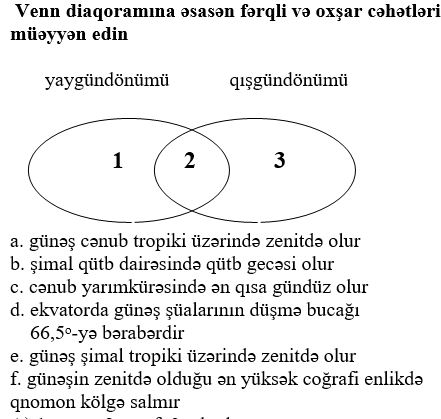 Coğrafiya bölmələr Günəş sistemi tehsilim.info 672 Views Zəhmət olmasa, gözləyin... 1. C. Uilerin fikrinə əsasən işıq sürəti ilə hərəkət edən obyektlərin qara dəliyi tərk edə bilməməsinin səbəbiA.qravitasiya cazibə sahəsinin çox böyük olması B.kütləvi vulkan püskürməsiC.kainatın böyük olması və buradakı cisimlərin fırlanmasının zəifləməsiD.digər qalaktikaların təsirinin böyük olmasıE.iqlim dəyişmələri 2. A.Merkuri B.Venera C.Mars D.Yupiter E.Saturn 3. Uyğunluğu tapın1. Merkuri 2. Yer 3. Mars a) öz oxu ətrafında həddən artıq yavaş fırlanır və zəif atmosferə malikdir b) həyatın mövcudluğu vardır, cazibə qüvvəsi böyükdür c) Günəşdən olan məsafə əlverişli temperatur şəraiti yaradır d) səthi nəhəng çökəkliklərdən və kraterlərdən təşkil olunuşdur e) səmada qırmızı rəngdə görünən planetdirA.1 – a, d; 2 – b, c; 3 – e B.1 – a; 2 – b, c; 3 – d, eC.1 – d; 2 – c, e; 3 – a, bD.1 – a, e; 2 – b, d; 3 – eE.1 – e; 2 – c, d; 3 – a, b 4. Ayın Yerdən yalnız bir tərəfinin görünməsinin səbəbi:A.Ayın öz oxu ətrafında fırlanma dövrünün Yer ətrafında fırlanma dövrünə bərabər olmasıB.cazibə qüvvəsinin böyük olması və temperatur amplitudasının çox olmasıC.Günəş ətrafında fırlanma sürətinin çox böyük olmasıD.əsasən bərk süxurlardan təşkil olunması və daxilə doğru süxurların sıxlığının azalmasıE.Ayın öz oxu ətrafında fırlanma dövrünün Yer ətrafında fırlanma dövründən çox az olması 5. Aşağıdakılardan hansı doğrudur?A.B.C.D.E. 6. “ Böyük partlayış” nəzəriyyəsinə görə kainatın başlanğıcından indiyə qədər baş verən hadisələrin ardıcıllıqla düzün: 1. ilk ulduzların yaranması 2. ilk yeni qara dəliklərin yaranması 3. kosmik relikt şüalanma 4. protoqalaktikaların qovuşması 5. müasir qalaktikalar 6. qaranlıq dövrA.3, 6, 1, 4, 2, 5 B.3, 6, 1, 2, 4, 5C.6, 3, 4, 1, 5, 2 D.6, 4, 2, 1, 5, 3 E.1, 3, 4, 2, 6, 5 7. Bakıda saat 1030-dur. Ondan cənub-şərqdə yerləşən yay gündönümündə günəş şüalarının 76,5o bucaq altında göründüyü A məntəqəsində isə saat 1410-dur. A məntəqəsinin yerləşdiyi saat qurşağını və onun coğrafi koordinatlarını tapın.VII, 10o şm.en. və 105o ş.u.A.VII, 10o şm.en. və 105o ş.u.B.XXIII, 10o şm.en. və 5o q.u.C.IV, 37o şm.en. və 55o ş.u.D.III, 10o cn.en. və 105o ş.u.E.VII, 10o cn.en. və 105o ş.u. 8. Uyğunluğu tapın1. daxili planetlər 2. xarici planetlər a) diametri böyükdür və səthində temperatur çox aşağıdır b) hidrogendən təşkil olunmuş nəhəng qaz kütləsindən ibarətdir c) Günəş əıtrafında fırlanma müddəti böyükdür d) sıxlığı çoxdur e) peykləri daha azdır və hətta yoxdurA.1 – d, e; 2 – a, b, c B.1 – a, b; 2 – c, d, e C.1 – c, d, e; 2 – a, b D.1 – a, b, e; 2 – c, d E.1 – a, b, c; 2 – d, e 9. Günəş 21 sentyabr günü yuxarıdakı kimi A məntəqəsindən 3 saat geridə olan zaman yerli saatı A-dan 3 saat irəlidə olan B mərkəzindəki vəziyyəti müəyyən edin:A.B.C.D.E. 10. A.1 – C; 2 – B; 3 – D; 4 – AB.1 – A; 2 – B; 3 – C; 4 – DC.1 – C; 2 – D; 3 – B; 4 – A D.1 – B; 2 – A; 3 – D; 4 – CE.1 – C; 2 – D; 3 – A; 4 – B 11. Uyğunluğu tapın1. Günəş fəallığı 2. Günəş ləkələri 3. Günəş küləyi 4. Maqnit qasırğaları a) Günəş küləyinin qasırğa şəklində Yer atmosferinə daxil olması və Yerin maqnit sahəsi ilə qarşılıqlı təsirindən əmələ gəlir b) Günəşdə baş verən bütün fiziki dəyişikliklərin məcmusu c) Günəşdən kosmik fəzaya şüaların, hissəciklərin, maqnit sahələrinin məcmusudur d) Günəşin səthində temperaturun nisbətən aşağı olduğu hissələrin Yerdən görünüşüA.1 – b; 2 – c; 3 – b; 4 – aB.1 – d; 2 – b; 3 – a; 4 – cC.1 – c; 2 – d; 3 – b; 4 – aD.1 – b; 2 – d; 3 – c; 4 – a E.1 – a; 2 – b; 3 – c; 4 – d 12. A.1 – c, e; 2 – a, f; 3 – b, dB.1 – a, b; 2 – c, e; 3 – d, fC.1 – c, e; 2 – d, f; 3 – a, b D.1 – b, d; 2 – a, c; 3 – e, fE.1 – c, e; 2 – b, f; 3 – a, d 13. A.1,5B.3,4C.1,4D.3,5E.1,2 14. A.Florida yarımadası, Braziliya yaylası B.Baffin Torpağı, Çukot yarımadasıC.Braziliya yaylası, Çukot yarımadasıD.Florida yarımadası, Baffin TorpağıE.Braziliya yaylası, Baffin Torpağı 15. İlboyu gecə və gündüzün uzunluqları arasında vaxt fərqi daha az olan adalar:A.Britaniya, İslandiya B.Sardiniya, Kuril C.Şpitsbergen, Kuba D.Sumatra, QalapaqosE.İslandiya, Tasmaniya 16. Müşahidəçi aşağıdakı paralellər boyu qərbdən şərqə 400 km getdi. Hansı paralel boyunca hərəkət etsə daha çox meridian dərəcəsi qət edəcəkdir ?A.70o şm. en.B.ekvator C.25o cn.en.D.30o şm.en.E.50o cn.en. 17. 60o şm.en və 20o ş.u-dan şimal qütbünədək 0o azimutla, sonra 180o azimutla 5555 km məsafə qət edən təyyarənin endiyi A məntəqəsinə aid olan əlamətlər: qütb gecə və gündüzləri müşahidə olunur Bakıdan cənub-şərq istiqamətində yerləşir Günəş ildə iki dəfə zenitdə olur Bakı ilə 2 saat qurşaq fərqi var qütb işıqlanma qurşağında yerləşir qış gündönümündə günəş şüaları 43,5o bucaq altında düşürA.4,5B.2,6C.1,3D.2,4E.1,5 18. A.60 və 40 B.70 və 50 C.65 və 45 D.75 və 40 E.60 və 50 19. Hansı məntəqələrdə fəsli dəyişkənlik aydın müşahidə edilmir 80o cn. en. və 125o q.u. 38o cn. en. və 135o ş.u. 7o şm. en. və 15o ş.u. 44o şm. en. və 75o ş.u. 4o cn. en. və 100o q.u. 40o şm. en. və 20o ş.u.A.2,4,6B.1,2,3C.1,3,5D.4,5,6E.1,3,6 20. A.2,4,6B.1,2,3C.1,4,5D.4,5.6E.1,3,6 Loading...