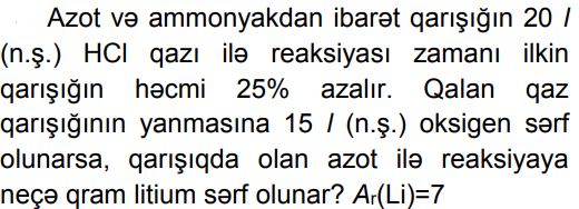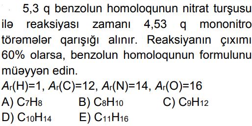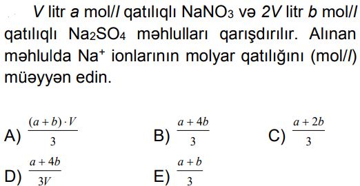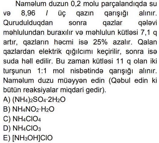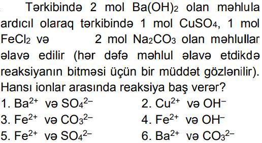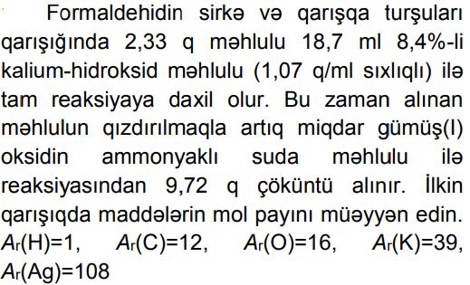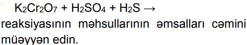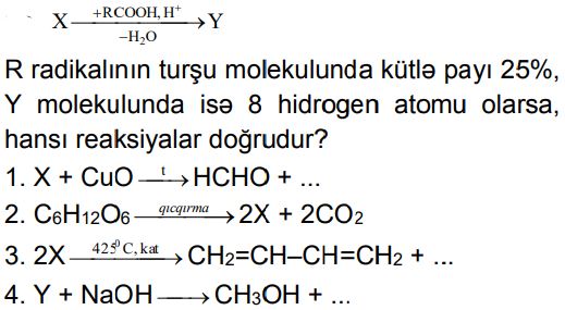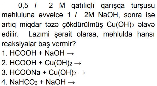 Kimya – Olipiada sualları (11 sinif) Zəhmət olmasa, gözləyin... 1. A..B..C..D..E.. 2. A..B..C..D..E.. 3. A. 1B. 9C. 18D. 24E. 36 4. A..B..C..D..E.. 5. A..B..C..D..E.. 6. A. 13B. 17C. 21D. 25E. 19 7. A. 8B. 10C. 12 D. 14E. 18 8. A.7,1B.14,2C.11,3D.18,1E.11,0 9. A.2,4-dimetilheksanB.2,3-dimetilheksanC.2,5-dimetilheksanD.3,3-dimetilheksan E.3,4-dimetilheksan 10. A.20% HCOOH, 40% CH3COOH, 40% HCHO B.25% HCOOH, 50% CH3COOH, 25% HCHOC.10% HCOOH, 50% CH3COOH, 40% HCHOD.20% HCOOH, 30% CH3COOH, 50% HCHOE.30% HCOOH, 20% CH3COOH, 50% HCHO 11. A. I, II B. II, IIIC. I, III D. I, IV E. II, IV 12. A.1, 2B. yalnız 2C.2, 4D.3, 4E. yalnız 4 13. A..B..C..D..E.. 14. A.21B.42C.84D.75E.63 15. A. 1, 3B. 1, 4C. yalnız 2 D. 2, 3E. 3, 4 16. A.322B.142C.161D.71E.284 17. A.metiletilikili-butilmetanB.trimetilüçlü-butilmetanC.izopropilizobutilmetanD.metilpropilizopropilmetanE.metildietilmetan 18. A.2,24B.44,8C.22,4D.11,2E.4,48 19. Stirol molekulunda rabitələrin əmələ gəlməsində iştirak edən qeyri-hibrid orbitalların ümumi sayını müəyyən edin. A.12B.14C.16D.18E.24 20. A..B..C..D..E.. 21. A.2b – aB.b – a C.2a – b D.2b + a E.2a + b 22. A.1, 3, 5 B.yalnız 2, 4, 6 C.1, 2, 3, 4 D.2, 3, 5 E.1, 2, 4, 6 23. A..B..C..D..E.. 24. A..B..C..D..E.. 25. A.8,4B.8,5C.8,6D.8,8E.8,9 Loading...