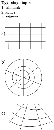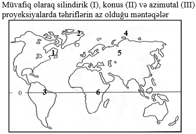 Coğrafiya bölmələr Kartoqrafik proyeksiyalar tehsilim.info 1191 Views Zəhmət olmasa, gözləyin... 1. Xəritələrdə təhriflərin yaranma səbəbi yerin forması bütün paralel və meridianların uzunluqlarının müxtəlif olması kürə səthindən müstəvi səthinə keçməsi Yerin ekvatordan basıq olmasıA.1,3B.1,4C.2,3D.3,4E.1,2 2. Təhrifin hansı növü yoxdurA.məsafə (uzunluq) B.formaC.bucaqD.hündürlük E.sahə 3. Azimutal proyeksiyada ən az təhrif olunan materiklər:A.Avrasiya, Şimali Amerika, Antarktida B.Afrika, Antarktida, AvstraliyaC.Afrika, Avstraliya, Şimali AmerikaD.Antarktida, Afrika, CənubiAmerikaE.Antarktida, Avrasiya, Avstraliya 4. Uyğunluğu tapın kartoqrafik şəbəkə coğrafi şəbəkə xəritədə meridian və paralellərin əmələ gətirdiyi şəbəkədir planda meridian və paralellərin əmələ gətirdiyi şəbəkədir qlobusda meridian və paralellərin əmələ gətirdiyi şəbəkədirA.1 – c; 2 – b B.1 – b; 2 – cC.1 – a; 2 – b D.1 – b; 2 – aE.1 – a; 2 – c 5. Silindirik proyeksiyada ən çox təhrif olunan ölkələr:A.İndoneziya, Çin, Kanada B.Braziliya, Avstraliya, ABŞC.Konqo, İndoneziya, BraziliyaD.Rusiya, Kanada, NorveçE.Hindistan, Fransa, Argentina 6. Uyğunluğu tapın: 1. silindirik 2. konus 3. azimutal a. meridian və paralellər düz xətt şəklində təsvir edilir b. yarımkürələrin fiziki xəritəsi əsasən bu proyeksiyada tərtib olunur c. 47o şm.e və 62o şm.e.-də təhriflər olmur d.əsasən Günəşin zenit enlikləri daha dəqiq təsvir olunur e. meridianlar şaxələnmiş, paralellər çevrə şəklində təsvir olunurA.1 – a, d; 2 – b, c; 3 – eB.1 – a, d; 2 – c; 3 – b, e C.1 – b, c; 2 – a, d; 3 – eD.1 – e; 2 – b, c; 3 – a, d E.1 – b; 2 – a, c; 3 – d, e 7. Çoxüzlü proyeksiya üçün səhvdir1. Yer səthi kürə deyil, çoxlu sayda trapesiyalara bölünmüş formada təsvir olunur 2. xəritənin miqyası əsasən kiçik olur 3. daha çox böyük ərazilər təsvir edilir 4. kiçik ərazilərin təsvirində, topoqrafik xəritələrin tərtibi zamanı istifadə olunurA.2,3B.2,4C.1,3D.1,2E.2,4 8. Bütün xəritələrdə hansı təhriflər mütləq olur? uzunluq 2. bucaq 3. forma 4. sahəA.1,4B.2,4C.1,3D.1,2E.2,3 9. A.I – 3, 6; II – 2, 4; III – 1, 5B.I – 3, 6; II – 1, 2; III – 4, 5 C.I – 1, 5; II – 3, 6; III – 2, 4D.I – 2, 4; II – 1, 5; III – 3, 6E.I – 3, 6; II – 1, 5; III – 2, 4 10. Azimutal proyeksiyada ən az təhrif olunan ölkələr: 1. Nigeriya 2. İslandiya 3. İsveç 4. FilippinA.1,4B.2,4C.1,3D.1,2E.2,3 11. Uyğunluğu tapın:1. bərabərbucaqlı proyeksiya 2. bərabərsahəli proyeksiya 3. ixtiyarı proyeksiya a. materik və okeanların ərazilərinin hesablanmasında istifadə olunur b. dəniz nəqliyyatında və aviasiyada istifadə edilir c. D. Qall və A. Petersin proyeksiyaları buna aiddir d. sahə və bucaq təhrifi olur və ən çox tədris məqsədilə istifadə olunur e. H. Merkatorun tərtib etdiyi xəritə buna aiddirA.1 – a, e; 2 – b, c; 3 – dB.1 – a, d; 2 – c; 3 – b, e C.1 – b, c; 2 – a, d; 3 – eD.1 – b, e; 2 – a, c; 3 –d E.1 – b; 2 – a, c; 3 – d, e 12. Təhriflərin dərəcəsi nədən asılıdır:1. ərazinin böyüklüyündən 2. yerin qabarıq formada olmasından 3. coğrafi enlikdən 4. ərazinin geoloji quruluşundan 5. miqyasın xəritənin bütün hissəsində eyni olmasındanA.1,3B.3,4C.1,4D.1,5E.2,5 13. Silindirik proyeksiyada ən az təhrif olunan materiklər:A.Avrasiya, Şimali Amerika B.Afrika, AntarktidaC.Afrika, AvstraliyaD.Şimali və CənubiAmerikaE.Antarktida, Avrasiya 14. Uyğunluğu tapın 1. silindirik 2. konus 3. azimutal a. meridianlar şaxələnmiş, paralellər yarımçevrə şəklində təsvir olunur b. ekvatorial enliklər daha dəqiq təsvir olunur c. mülayim enliklər daha mükəmməl təsvir olunur d. coğrafi qütblərin təsvirində təhrif azdır e. Antarktida və Şimal Buzlu okeanı daha dəqiq təsvir olunurA.1 – a, e; 2 – b, c; 3 – dB.1 – a, d; 2 – c; 3 – b, e C.1 – b, c; 2 – a, d; 3 – eD.1 – b, e; 2 – a, c; 3 –d E.1 – b; 2 – a, c; 3 – d, e 15. Uyğunluğu tapın1. silindirik proyeksiya 2. konus proyeksiya 3. azimutal proyeksiya a. Amazon ovalığı b. Qərbi Sibir düzənliyi c. Labrador yarımadası d. Qrenlandiya adası e. AntarktidaA.1 – a, e; 2 – b, c; 3 – dB.1 – a; 2 – b, c; 3 – d, e C.1 – b, c; 2 – a, d; 3 – eD.1 – b, e; 2 – a, c; 3 –dE.1 – b; 2 – a, c; 3 – d, e 16. Azimutal proyeksiyada ən çox təhrif olunan ölkələr1. Braziliya 2. Efiopiya 3. Kanada 4. FinlandiyaA.1,4B.3,4C.1,3D.1,2E.2,3 17. Təhrif xüsusiyyətinə görə kartoqrafik proyeksiyaların növləri: 1. silindrik 2. bərabərsahəli 3. ixtiyari 4. konus 5. azimutalA.1,4,5B.1,2,4C.1,3,5D.1,2,3E.2,3,4 18. A.1- a; 2 – b; 3 – cB.1- a; 2 – c; 3 – b C.1- b; 2 – c; 3 – aD.1- c; 2 – a; 3 – bE.1- c; 2 – b; 3 – a Loading...