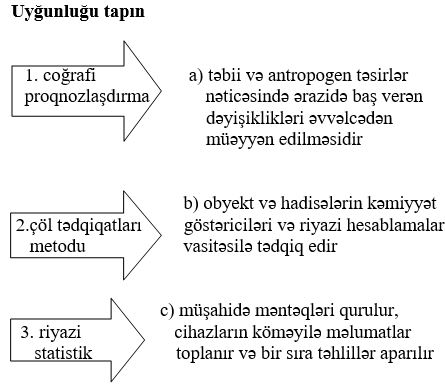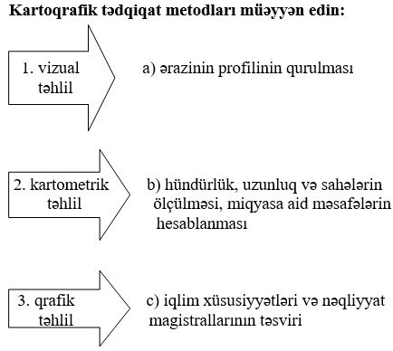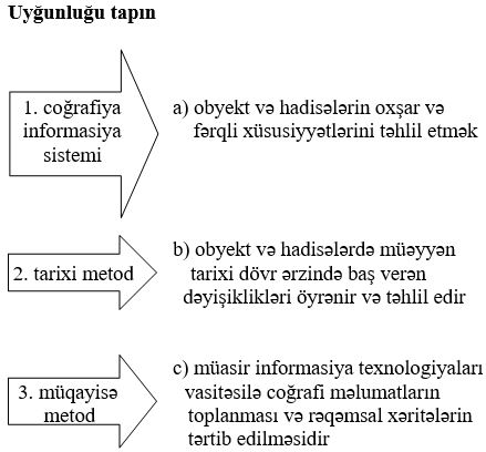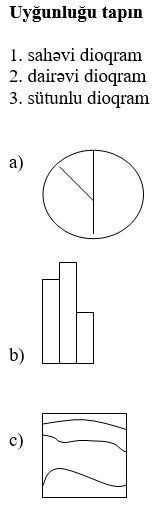 Coğrafiya bölmələr Xəritədə təsvir üsulları tehsilim.info 1488 Views Zəhmət olmasa, gözləyin... 1. Uyğunluğu tapın:1. xəritə-sxem 2. kartoqram 3. kartodioqram a. məlumatlar həndəsi fiqurlar vasitəsilə verilir b. coğrafi məlumatların sadələşdirilmiş, ümumiləşdirilmiş şərti işarəli coğrafi təsvirdir c. hər hansı bir göstəricinin ərazi daxilində dəyişməsini vizual əks etdirən təsvirdir d. coğrafi xəritəsi ilə dioqramın birləşməsidir e. müxtəlif ştrixlər, rənglər və nöqtələrlə təsvir olunurA.1 – a, e; 2 – b, c; 3 – dB.1 – a; 2 – b, c; 3 – d, e C.1 – b; 2 – c, e; 3 – a, dD.1 – b, e; 2 – c; 3 –a, d E.1 – b; 2 – a, c; 3 – d, e 2. A.kartoqram B.xəritə-sxem C.izoxətlərD.hərəkət E.kartodioqram 3. A.1- a; 2 – b; 3 – cB.1- a; 2 – c; 3 – b C.1- b; 2 – c; 3 – aD.1- c; 2 – a; 3 – bE.1- c; 2 – b; 3 – a 4. A.kartoqram B.xəritə-sxem C.izoxətlərD.hərəkət E.kartodioqram 5. A.1,4B.3,4C.1,3D.1,2E.2,3 6. Uyğunluğu tapın: 1. izoxətlər üsulu 2. nöqtələr üsulu 3. hərəkət üsulu a. əhalinin yerləşməsi, heyvanların sayını göstərir b. okean cərəyanları təsvir edilir c. relyefin təsvirində horizontallar göstərilir d. eyni temperatur və təzyiqə malik olan ərazilər göstərilir e. çayların axın istiqaməti göstərilirA.1 – c, d; 2 – a; 3 – b, e B.1 – a; 2 – b, c; 3 – d, e C.1 – a, c; 2 –d; 3 – b, eD.1 – c, e; 2 – b; 3 –a, d E.1 – b; 2 – a, c; 3 – d, e 7. A.nöqtələr B.izoxətlər C.arealD.hərəkət E.keyfiyyət fonu 8. Uyğunluğu tapın:1. areal üsulu 2. keyfiyyət fonu üsulu 3. hərəkət üsulu a. siyasi xəritələrdə dövlət əraziləri təsvir edilir b. dənizdə gəmilərin istiqaməti müəyyən edilir c. faydalı qazıntılaın, bitki və heyvan növlərinin yayıldığı sahələr təsvir edilir d. ovalıqlar, yüksəkliklər təsvir edilir e. qatarların yükdaşıma istiqaməti göstərilirA.1 – c, d; 2 – a; 3 – b, eB.1 – a; 2 – b, c; 3 – d, e C.1 – c; 2 –a, d; 3 – b, eD.1 – c, e; 2 – b; 3 –a, d E.1 – b; 2 – a, c; 3 – d, e 9. A.nöqtələr B.izoxətlər C.arealD.hərəkət E.keyfiyyət fonu 10. A.nöqtələr B.izoxətlər C.arealD.hərəkət E.keyfiyyət fonu 11. A.1- a; 2 – b; 3 – cB.1- a; 2 – c; 3 – b C.1- b; 2 – c; 3 – aD.1- c; 2 – a; 3 – bE.1- c; 2 – b; 3 – a 12. A.1- a; 2 – b; 3 – cB.1- a; 2 – c; 3 – b C.1- b; 2 – c; 3 – aD.1- c; 2 – a; 3 – bE.1- c; 2 – b; 3 – a 13. Uyğunluğu tapın:1. ənənəvi metod 2. müasir metod a. kartoqrafik b. riyazi – statistik c. coğrafi modelləşdirmə d. tarixi e. coğrafiya informasiya sistemiA.1 – b, c; 2 – a, d, eB.1 – a, c, e; 2 – b, dC.1 – b, e; 2 – a, c, eD.1 – a, d; 2 – b, c, e E.1 – a, b, e; 2 – c, d 14. A.1- a; 2 – b; 3 – cB.1- c; 2 – a; 3 – b C.1- b; 2 – c; 3 – aD.1- c; 2 – b; 3 – aE.1- a; 2 – c; 3 – b 15. A.1- a; 2 – b; 3 – cB.1- a; 2 – c; 3 – b C.1- b; 2 – c; 3 – aD.1- c; 2 – a; 3 – bE.1- c; 2 – b; 3 – a 16. A.sahəvi dioqramB.dairəvi dioqramC.sütunlu dioqram D.meridianal dioqramE.paralel dioqram Loading...